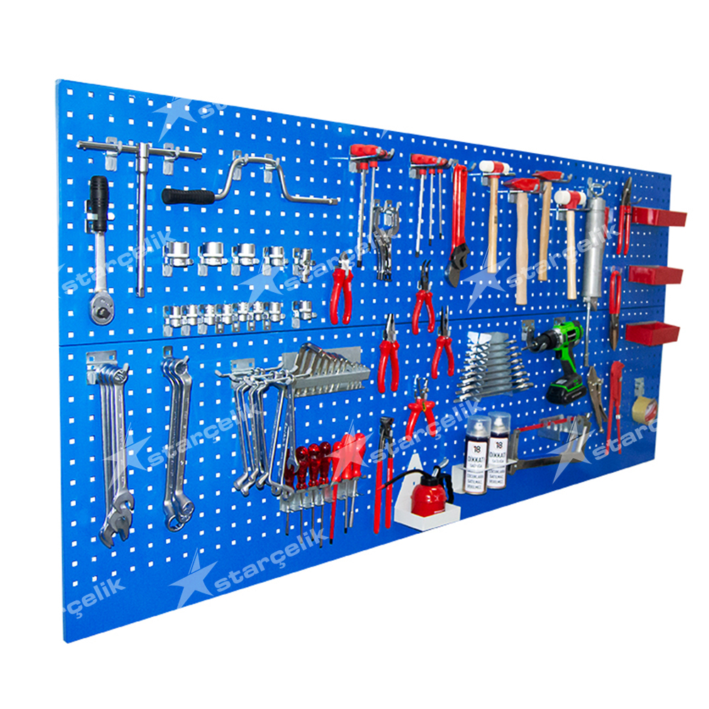 STAR ÇELİK duvar alet panosu, yüksek kalitede sac metalden üretilir, elektrostatik toz boya ile boyanır yüksek dayanımda ve sağlamlıktadır. Duvar alet panosu yan yana veya üst üste montaj edildiğinde delik aralıkları korunur. Geniş alanlarda esnemeler karşı parçalı alan alanı düşünülmüş olup esnemeler ve montajlama kolaylığı için takım asma panolarımız ek takviye profilleri ile desteklenmiştir, montaj lama işlemi gizli vida delikleri üzerinden yapılır. Vida ve dübel ile kolayca duvarlara ya da çalışma tezgâh arkalarına monte edilebilmektedir.