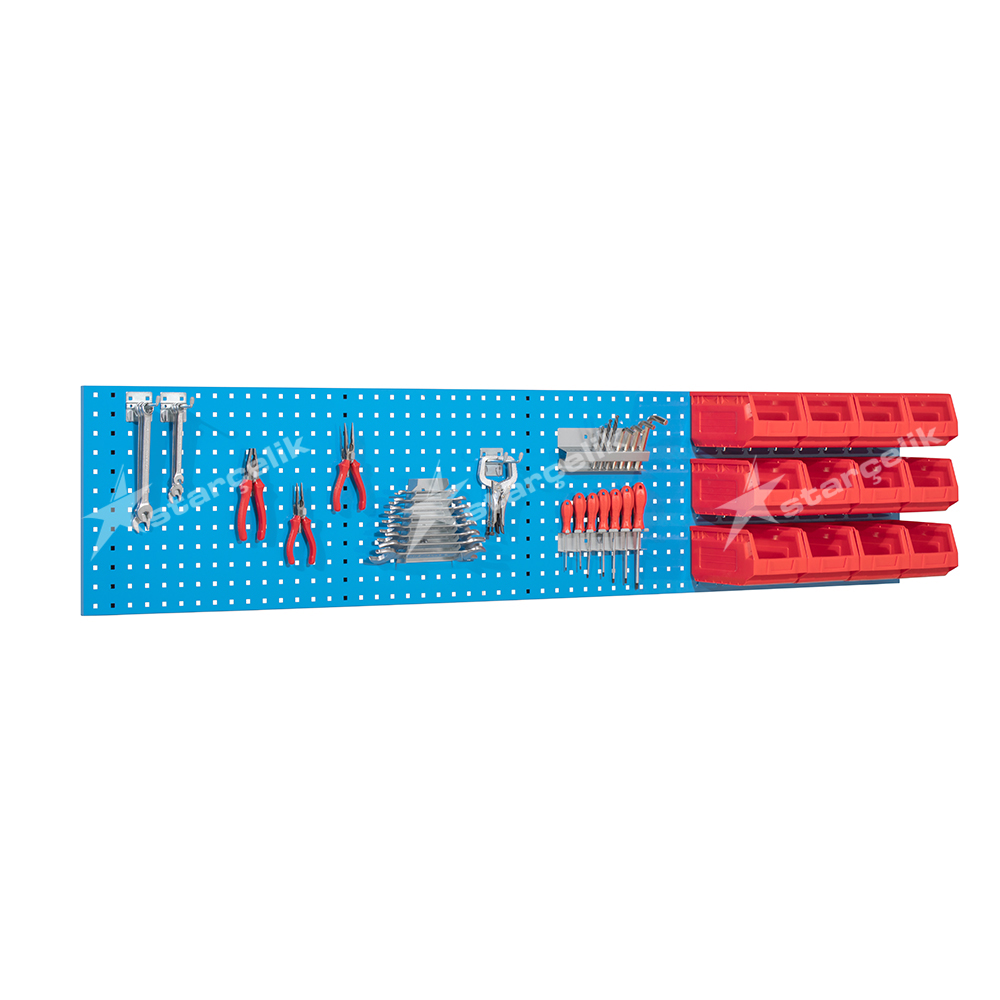 İstediğiniz boyutta plastik avadanlık kutusu takabiliyor olmanızın yanı sıra el aletlerinizi de kolaylıkla asabileceğiniz ikisi bir arada sistemlerimiz işlerinizde size hız kazandırmaktadır. Bu ürünü alarak yerden tasarruf edebilir ayrıca hem küçük parçalarınız için hem aletleriniz için iki ayrı çözüm üreterek masraf yapmanızı ortadan kaldıracaktır. Kutularımızın arka kısmında bulunan geçme tırnağı sayesinde panonun oluklu olan her alanına her ölçüde kutu takarak dizayn edebilirsiniz. Kutu renklerimiz mavi kırmızı ve siyah olmaktadır. Bu üründe kullanılan kutu ölçümüz PA03(12 adet) olarak düşünülmüştür.