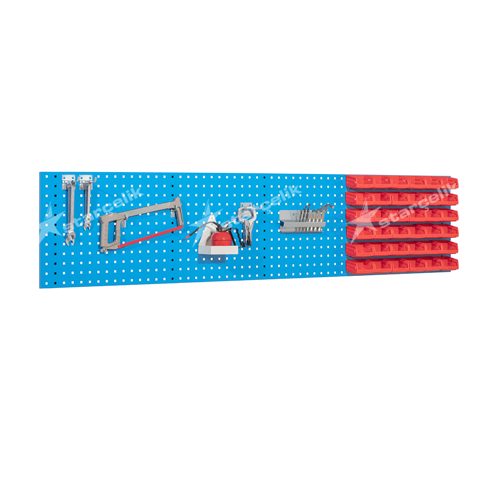 STAR ÇELİK takım asma panoları, yüksek kalitede sac metalden üretilir, elektrostatik toz boya ile boyanır yüksek dayanımda ve sağlamlıktadır. Takım asma panoları, yan yana veya üst üste montaj edildiğinde delik aralıkları korunur. Geniş alanlarda esnemeler karşı parçalı alan alanı düşünülmüş olup esnemeler ve montajlama kolaylığı için takım asma panolarımız ek takviye profilleri ile desteklenmiştir, montaj lama işlemi gizli vida delikleri üzerinden yapılır. Vida ve dübel ile kolayca duvarlara ya da çalışma tezgâh arkalarına monte edilebilmektedir.